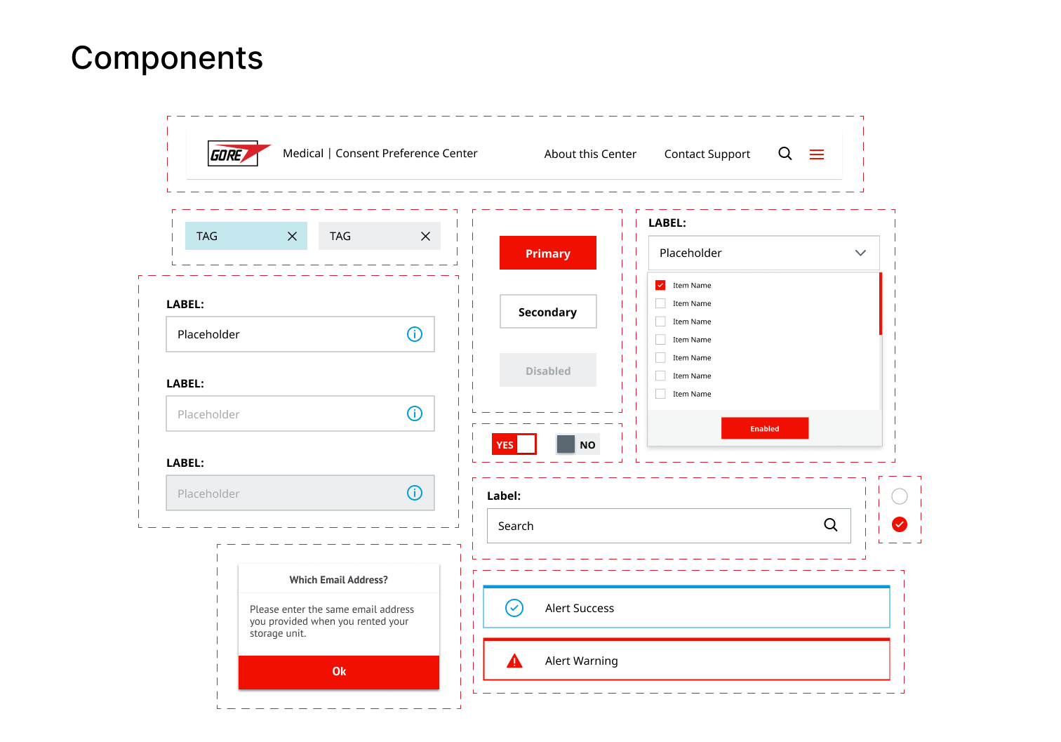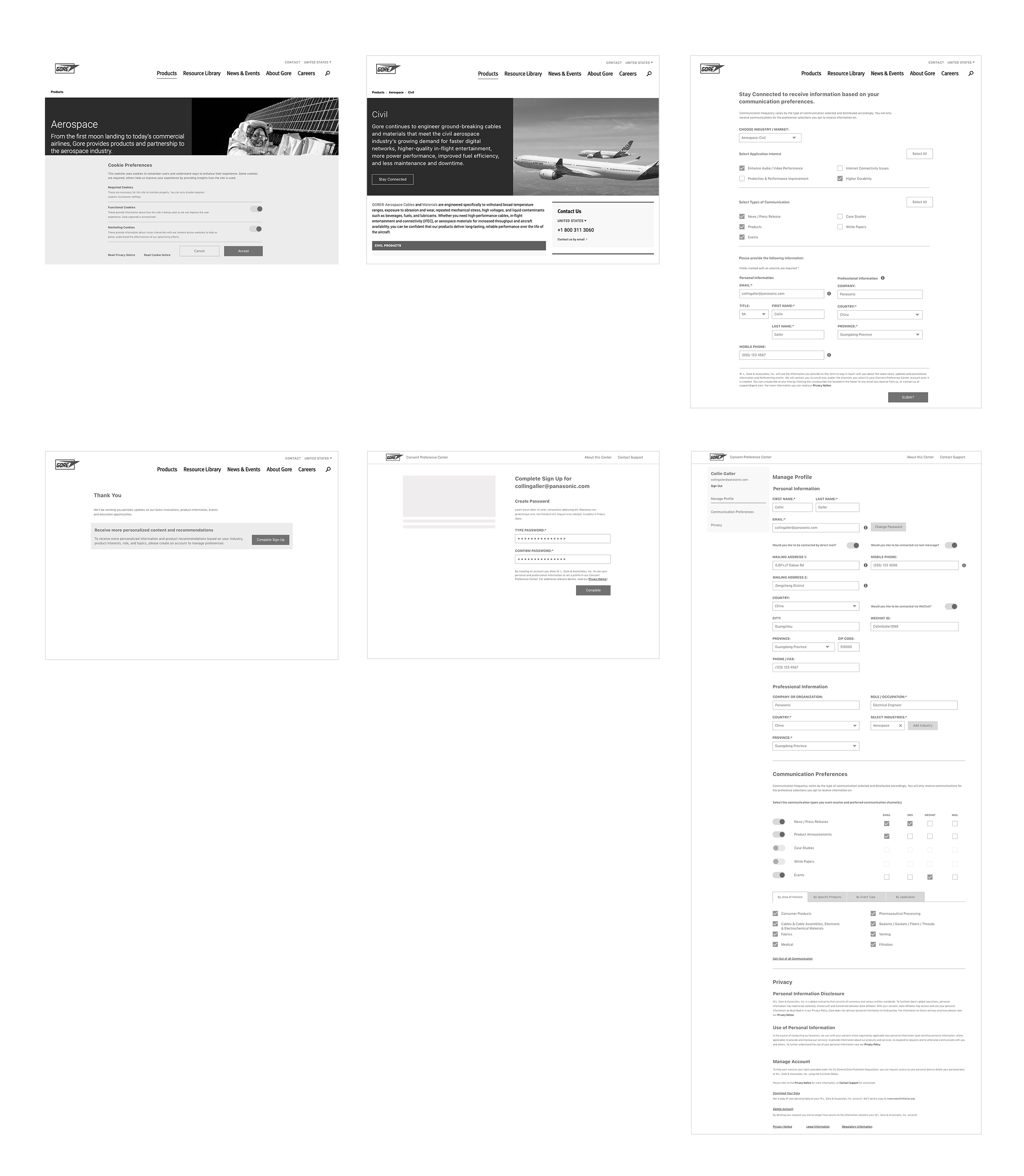 For Phase 1, I designed registration flows that felt native to each division's existing website — the sections were embedded, not standalone apps, so the visual language had to match GORE's established brand. We didn't have an existing style guide for these new sections, so I created components based on GORE's main site colors and typography, extending their design system with forms, checkboxes, dropdowns, and preference selectors.