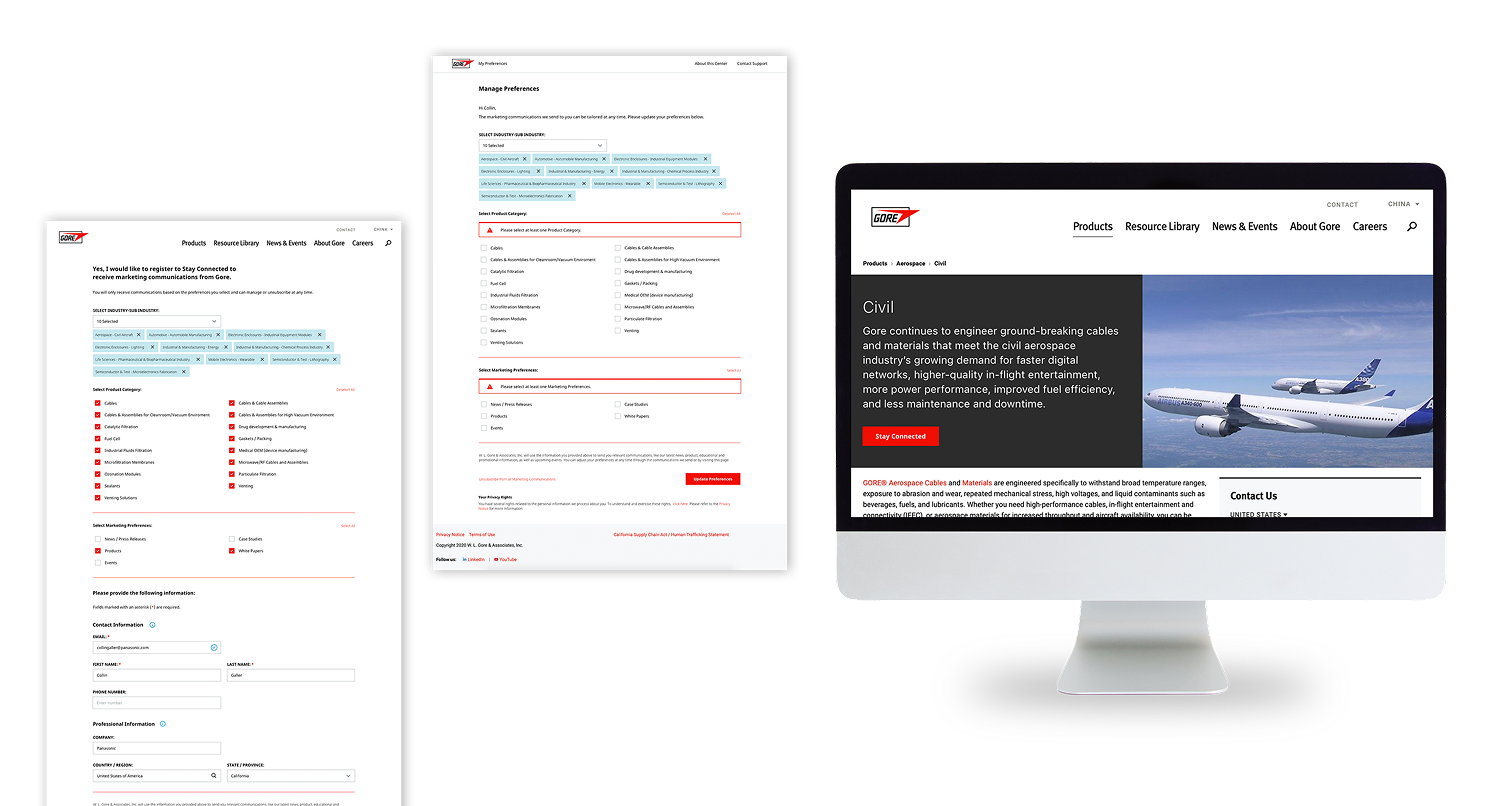 One solution I'm particularly proud of was the "login-less" preference management. Users could modify their communication preferences directly from an email link without creating a traditional account. For busy doctors and engineers, this removed a real friction point. On GORE's side, it still captured all the user data they needed for segmentation and analytics.
