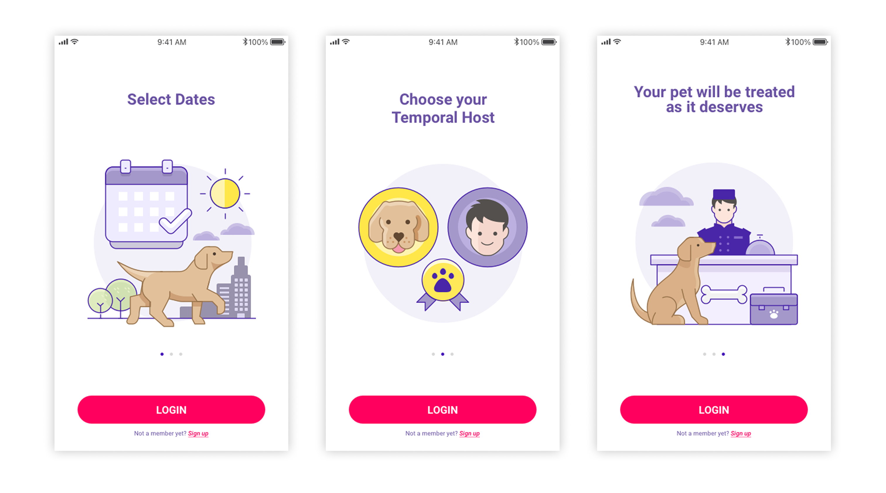 A clean, three-step walkthrough designed to build immediate trust. The flow concisely illustrates the platform's core model: connecting pet owners with verified local hosts for a safe, cage-free experience.
