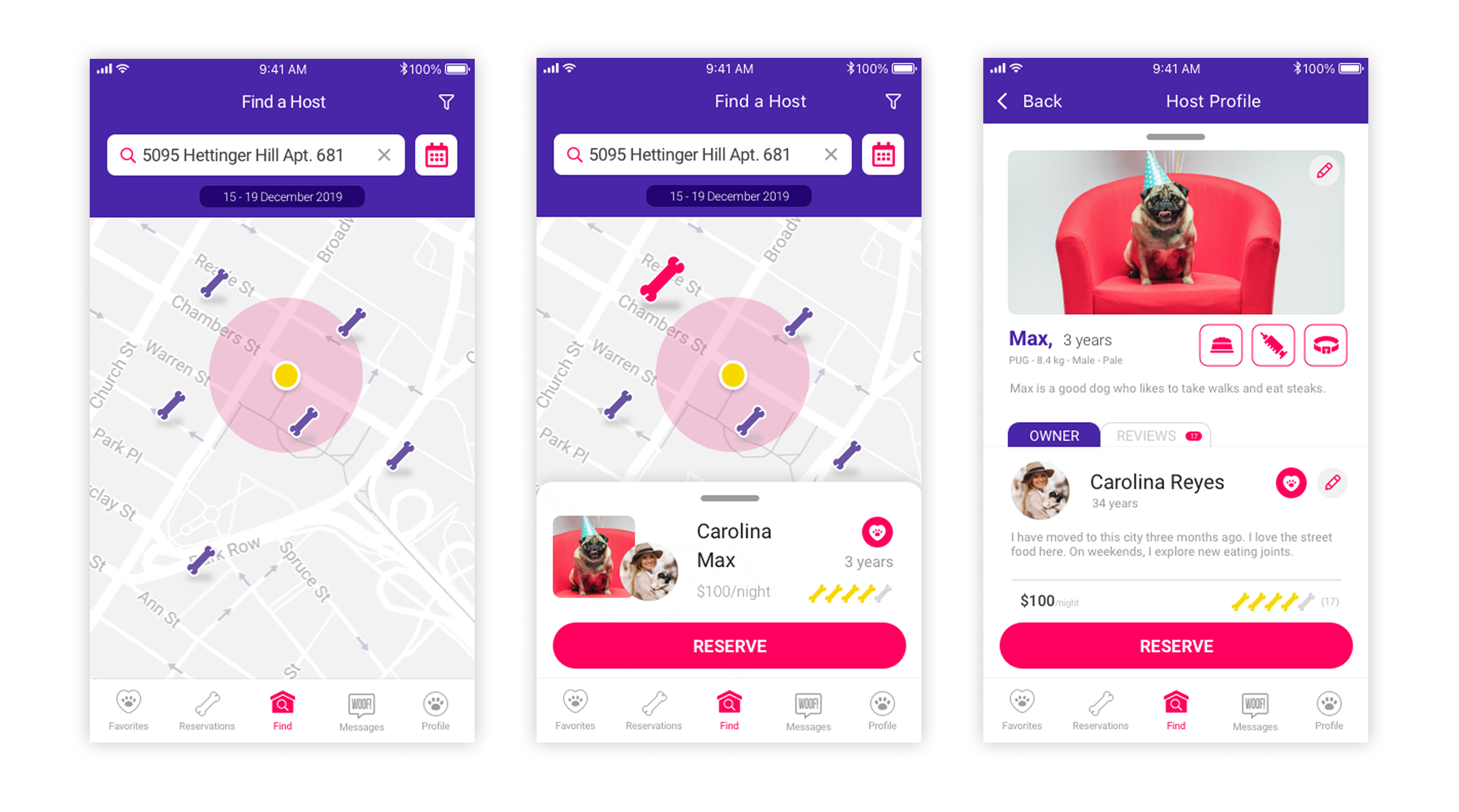 For the visual style, I used a clean, reassuring layout that highlights photography—allowing owners to see where their pet will sleep and play clearly. The UI elements were designed to guide the user through the vetting data, making the host’s verification badges and reviews prominent to reduce decision-making friction.